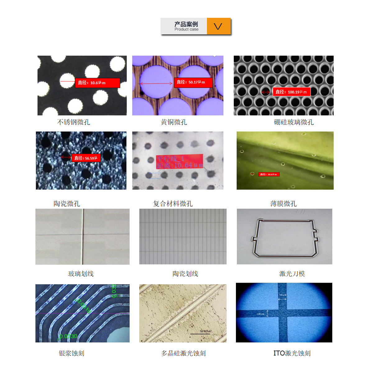 8、可用于加工陶瓷、玻璃、復(fù)合物、塑膠等基本所有的固體材料,能實(shí)現(xiàn)其蝕刻、盲孔、通孔、開槽、精密切割等工藝需求;