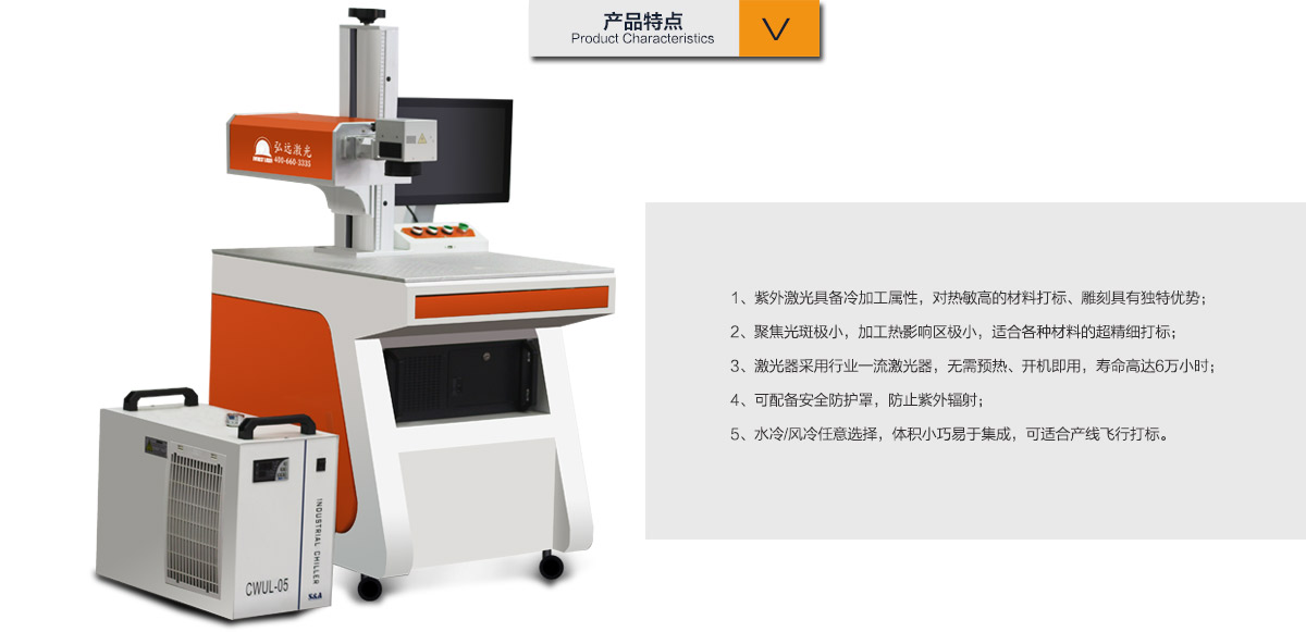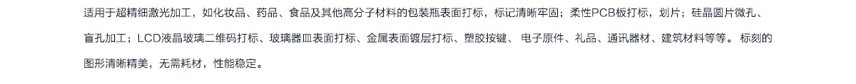 紫外激光打標(biāo)機(jī) 產(chǎn)品特點(diǎn): 紫外激光具備冷加工屬性,對(duì)熱敏高的材料打標(biāo)、雕刻具有獨(dú)特優(yōu)勢(shì); 聚焦光斑極小,加工熱影響區(qū)極小,適合各種材料的超精細(xì)打標(biāo); 激光器采用行業(yè)一流激光器,無需預(yù)熱、開機(jī)即用,壽命高達(dá) 6 萬小時(shí); 可配備安全防護(hù)罩,防止紫外輻射; 水冷 / 風(fēng)冷任意選擇,體積小巧易于集成,可適合產(chǎn)線飛行打標(biāo)。 適用范圍: 適用于超精細(xì)激光加工,如化妝品、藥品、食品及其他高分子材料的包裝瓶表面打標(biāo),標(biāo)記清晰牢固;柔性 PCB 板打標(biāo),劃片;硅晶圓片微孔、盲孔加工; LCD 液晶玻璃二維碼打標(biāo)、玻璃器皿表面打標(biāo)、金屬表面鍍層打標(biāo)、塑膠按鍵、 電子原件、禮品、通訊器材、建筑材料等等。 標(biāo)刻的圖形清晰精美,無需耗材,性能穩(wěn)定。
